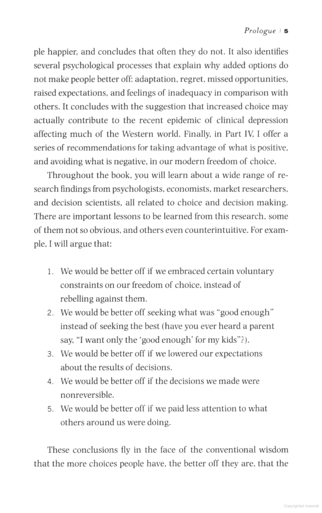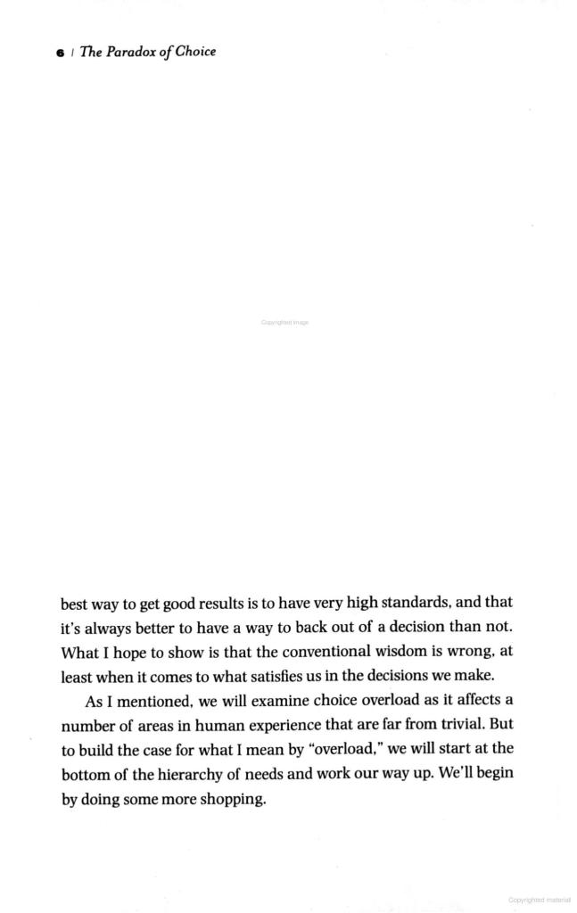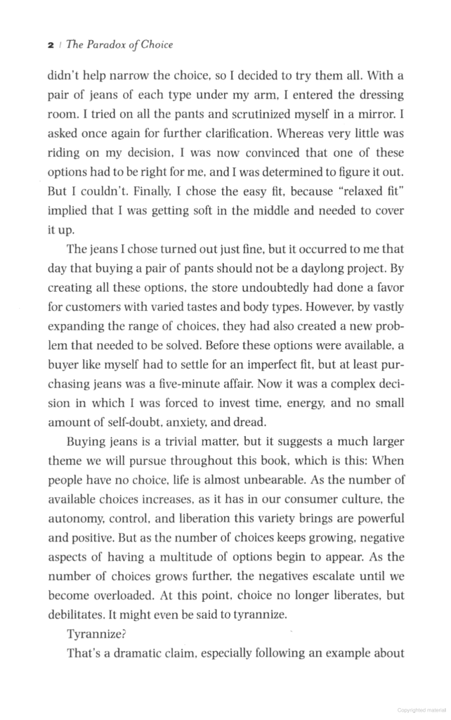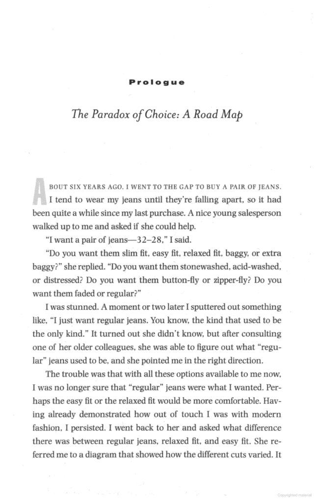 I wanted to go over a topic that is probably more well known than you’d think. I’ve seen it thrown around in social media and brought up in conversation, though most that do don’t understand the extent to which it can affect our lives. It’s called the Paradox of Choice. Coined by psychologist Barry Schwartz in his 2004 book The Paradox of Choice: Why More Is Less (I left a small preview under this block), the concept describes how, contrary to common assumptions, having too many choices can be overwhelming and detrimental rather than empowering. Modern life gives us an unprecedented amount of freedom, ranging from what we wear to what career we pursue. However, this comes with an unexpected side effect: choice overload, and in turn, a sense of regret.